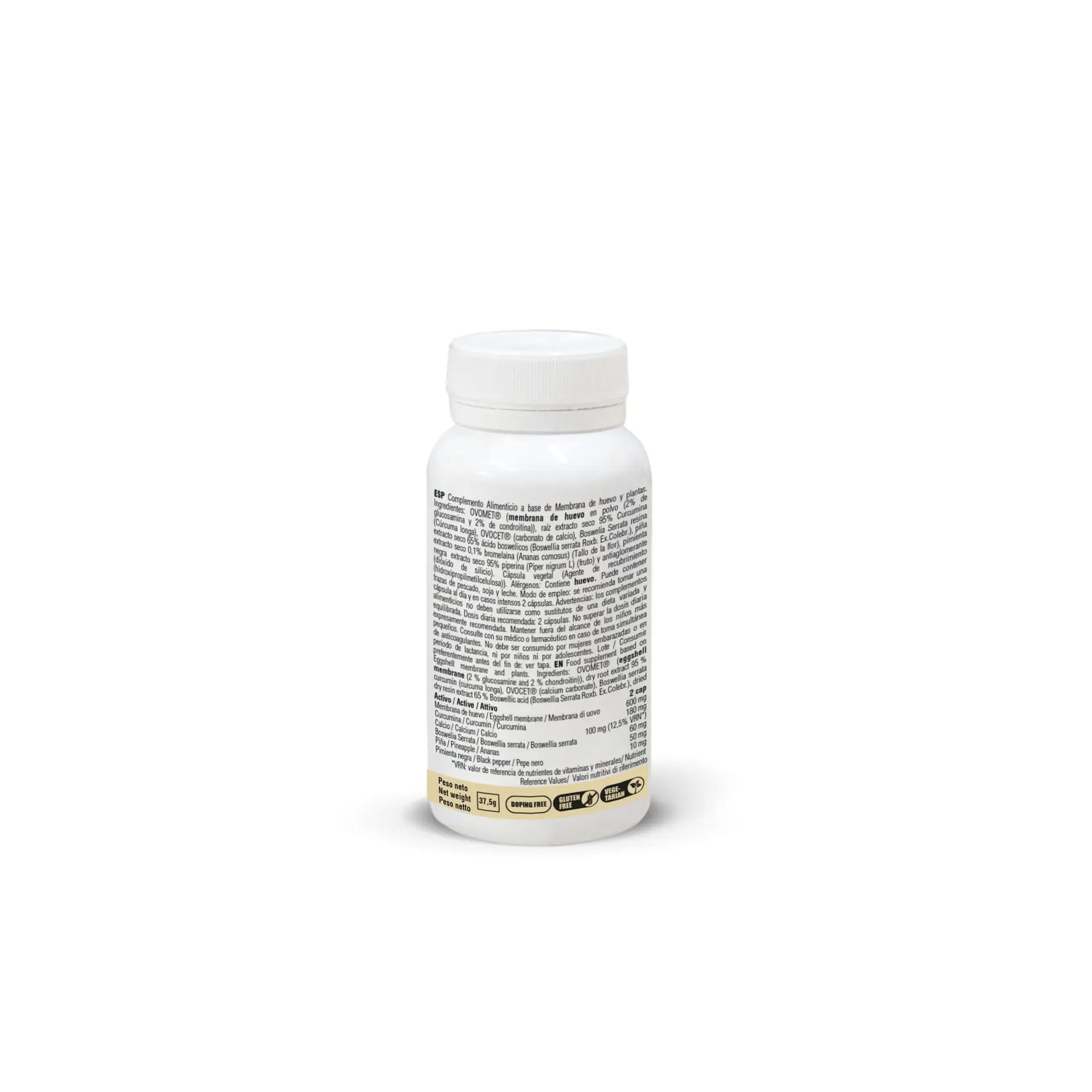 - Pokročilé zloženie: Membrána vaječnej škrupiny dodáva kľúčové zložky pre zdravie kĺbov a spojivového tkaniva, ako sú kolagén typu I, V a X, kyselina hyalurónová, glykozaminoglykány a aminokyseliny, ktoré podporujú regeneráciu a ochranu kĺbových štruktúr. Prídavok extraktu z Boswellia Serrata a kurkumy poskytuje silný protizápalový účinok, zmierňuje bolesti kĺbov a podporuje ich funkciu.